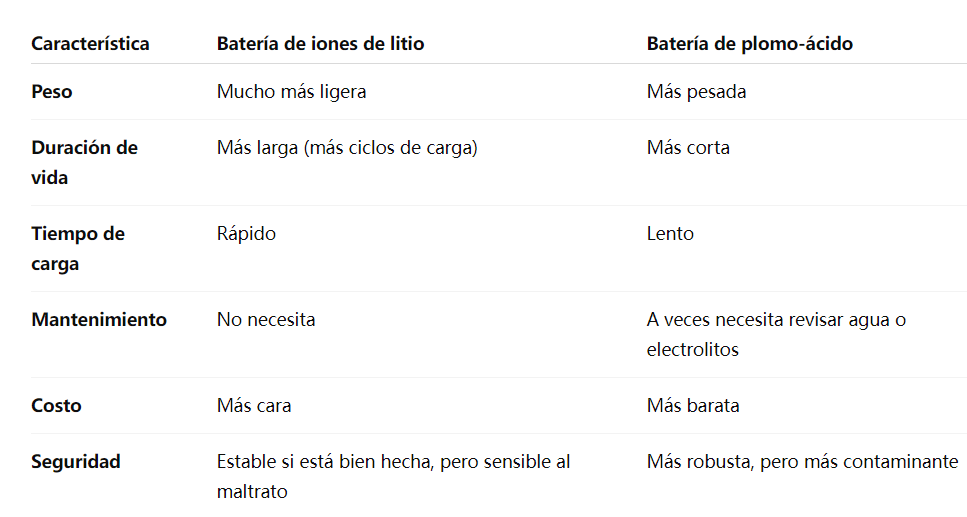 👉 Conclusión: si quieres algo ligero, duradero y rápido de cargar, litio es mejor. Si el presupuesto es bajo y el peso no importa, el plomo-ácido puede servir.