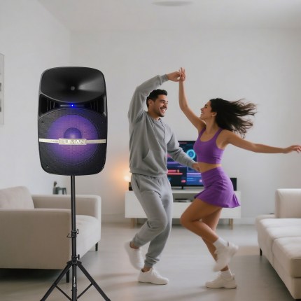 Con un diseño compacto y robusto (320 x 310,5 x 455 mm) y un peso de solo 9,5 kg, es fácil de transportar y perfecto para fiestas, presentaciones, reuniones familiares o eventos al aire libre.